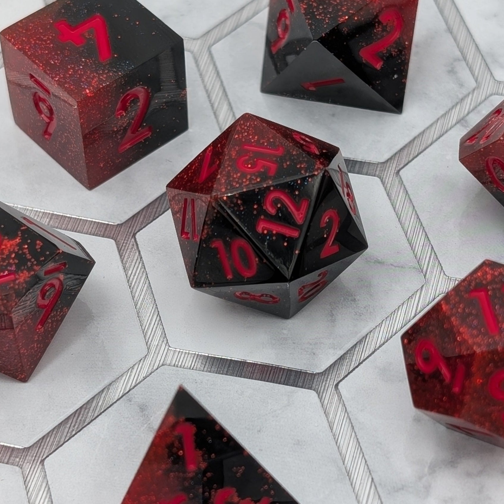 Why: You rage. Choose dice that are as loud and visceral as your battle cry. Darkflare is a blood red & black dice set with the blood red glitter slowly traveling into the darkness of the black. A very "metal" set for any barbarian.