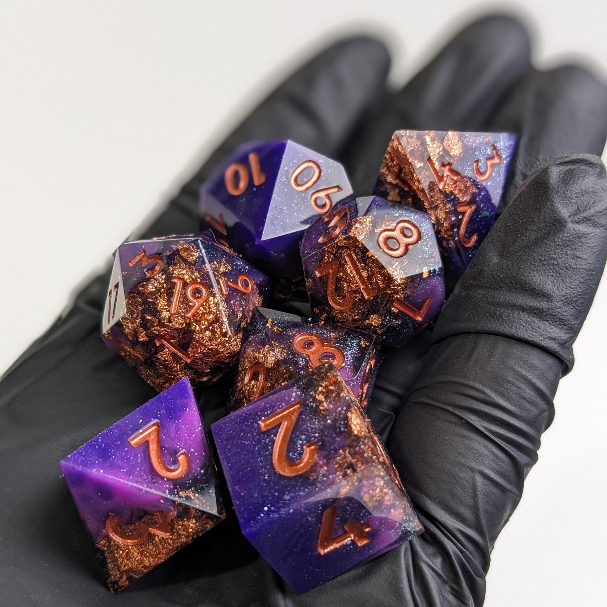 Why: Your dice should look like a magical invention—precise, detailed, and custom-forged. Emberlight Veil is a metalic inclusioned dice set that gives engineered vibes.