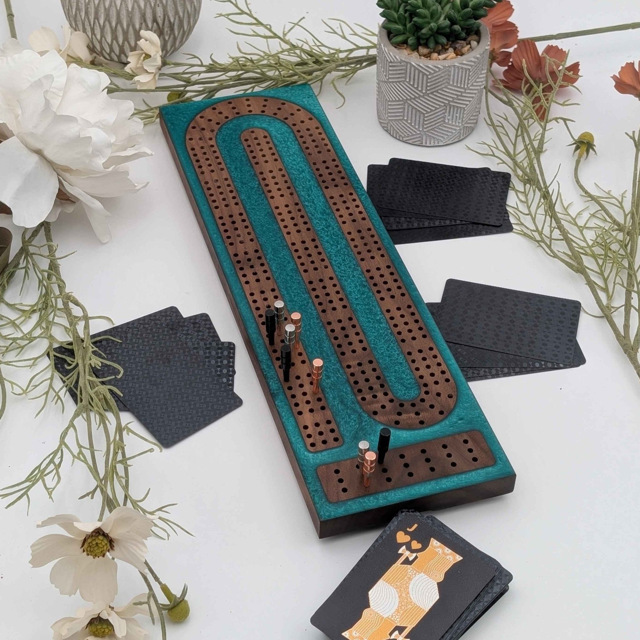 Reverse Pour Cobalt Resin Premium Cribbage Board - Three Lane Cribbage Board