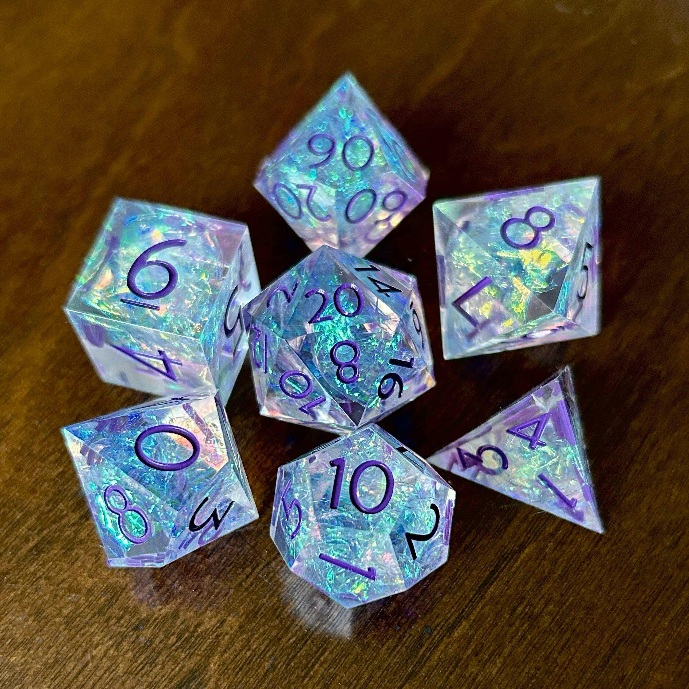 Sing your story in shimmering color with Bardic Embrace, a 7-piece sharp-edged dice set crafted for heroes, spellcasters, and storytellers alike. This stunning polyhedral dice set features translucent resin filled with radiant glitter flakes and vivid purple inked numbers—creating a look as enchanting as a bard’s melody.