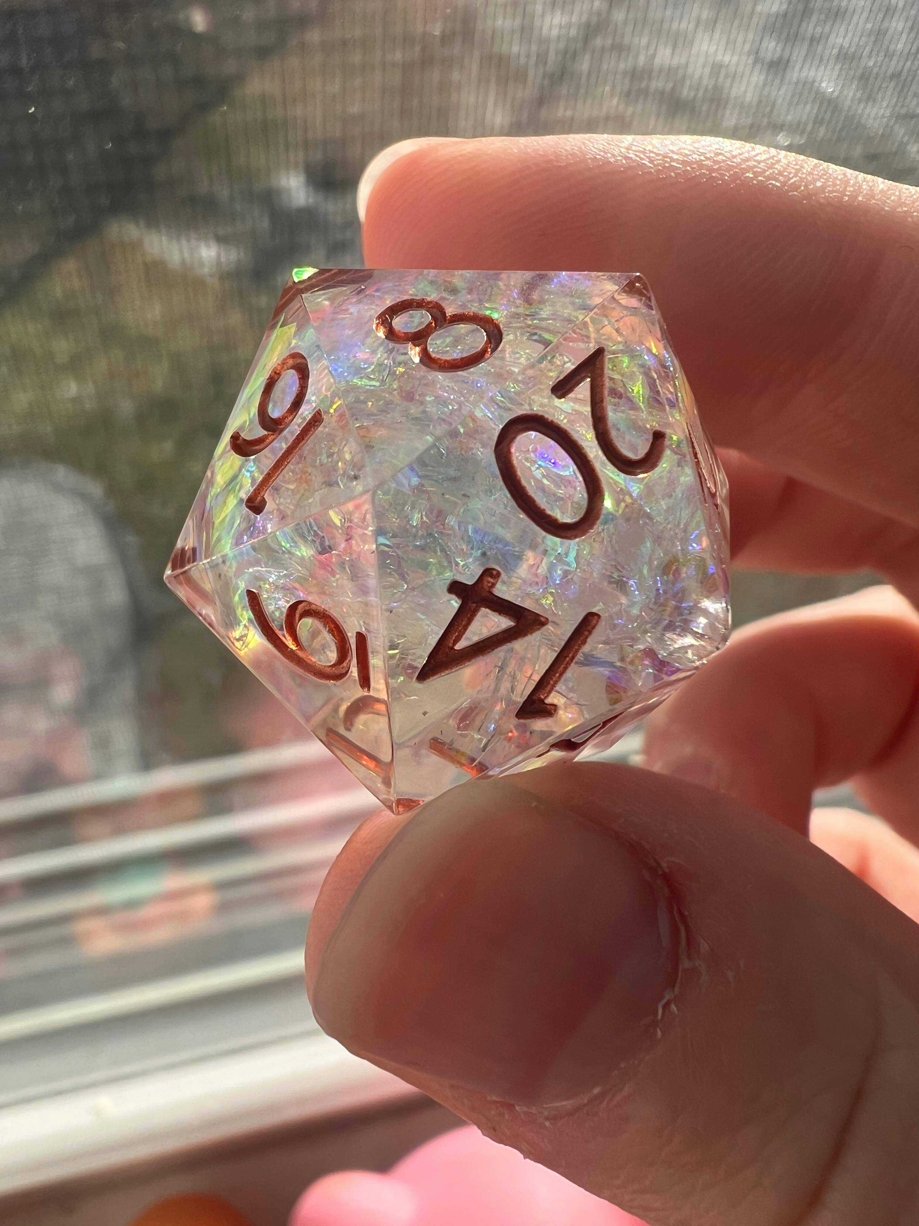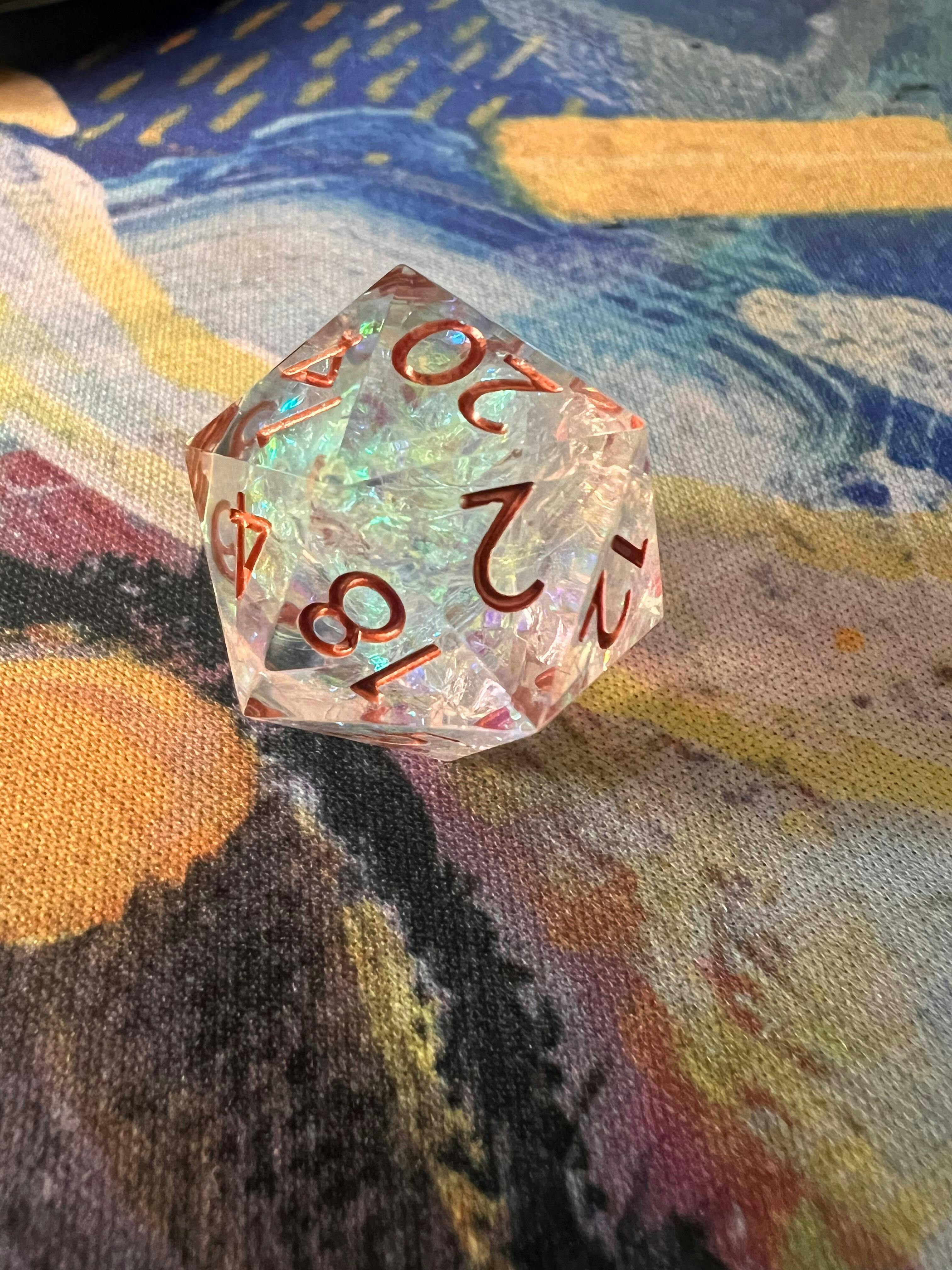 Peer through the arcane shimmer of Copperveil Lens, a sharp-edged polyhedral dice set crafted for Dungeons & Dragons, Pathfinder, and all your favorite TTRPGs. These handcrafted RPG dice are crystal-clear, revealing a suspended veil of iridescent blue-green mylar that dances with light like a hidden enchantment. Each number is painted in metallic copper, catching the eye with every roll.