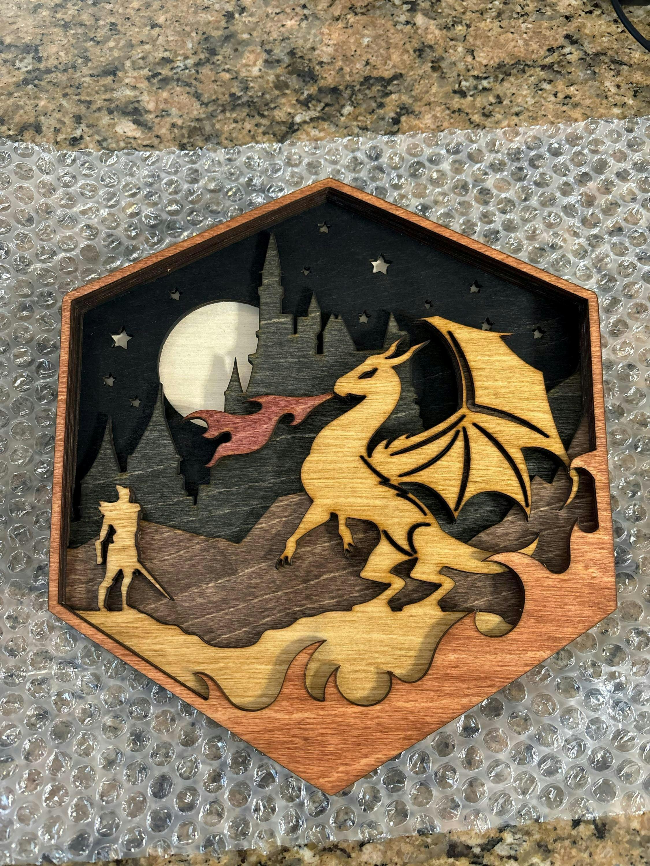 Step into a realm of wonder and adventure with our captivating Dragon's Tale art piece, specially crafted for Dungeons and Dragons enthusiasts and RPG lovers. This extraordinary artwork showcases the essence of a mystical world, expertly layered in six vibrant shades, each depicting a breathtaking night sky adorned with stars and a captivating full moon.