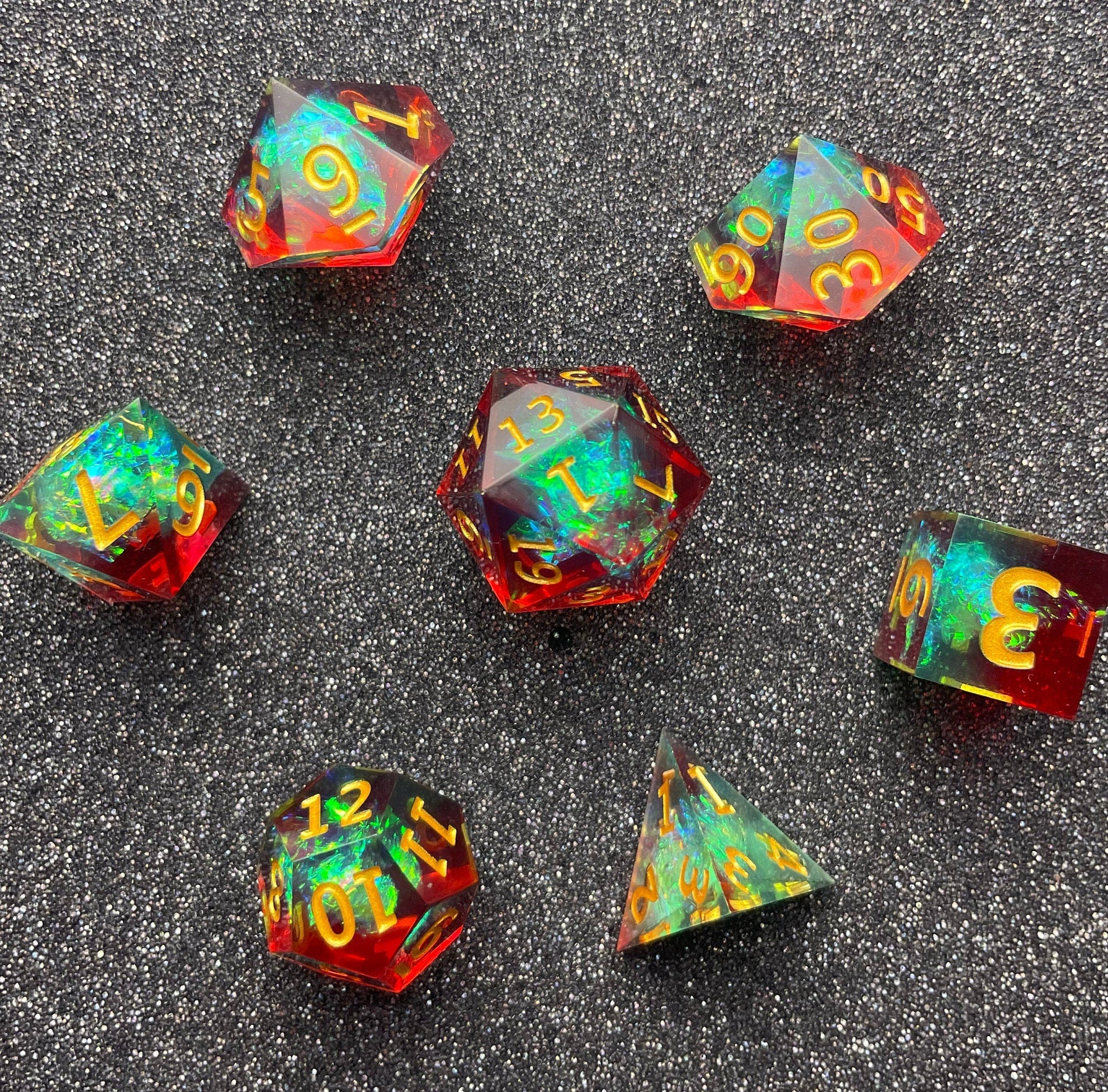 Ignite your tabletop adventures with the brilliance of Emerald Skyfire. This sharp-edge polyhedral dice set blends a radiant emerald core with fiery red resin, capturing the clash of flame and sky in every roll. Golden inking highlights each number, ensuring readability while adding a touch of regal elegance.