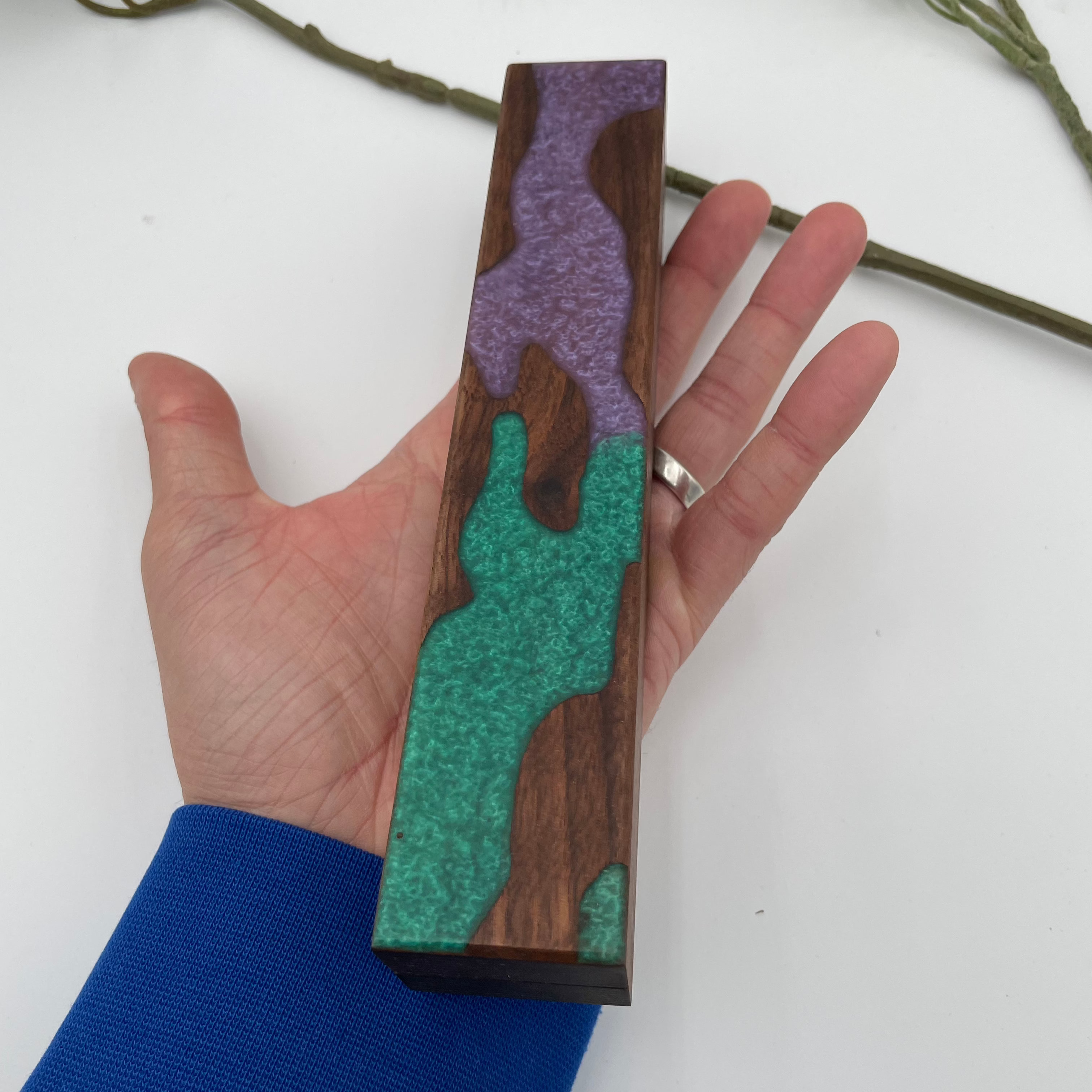 Gemwood Reliquary—a beautifully crafted walnut dice vault designed to hold a single set of dice. Its lid features an abstract, live-edge-inspired engraving, filled with vibrant emerald and amethyst resin. This unique blend of natural wood and mystical hues makes it the perfect accessory for adventurers looking to protect their most prized dice with style and flair.