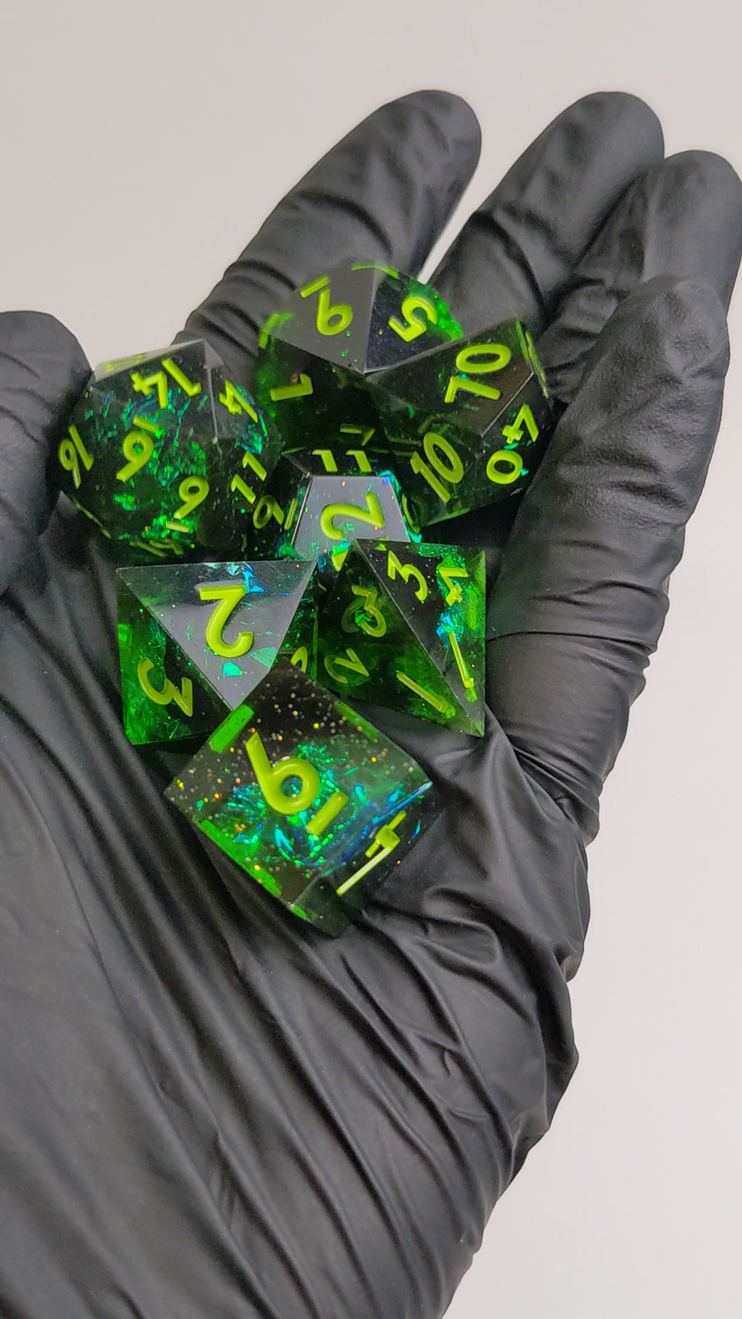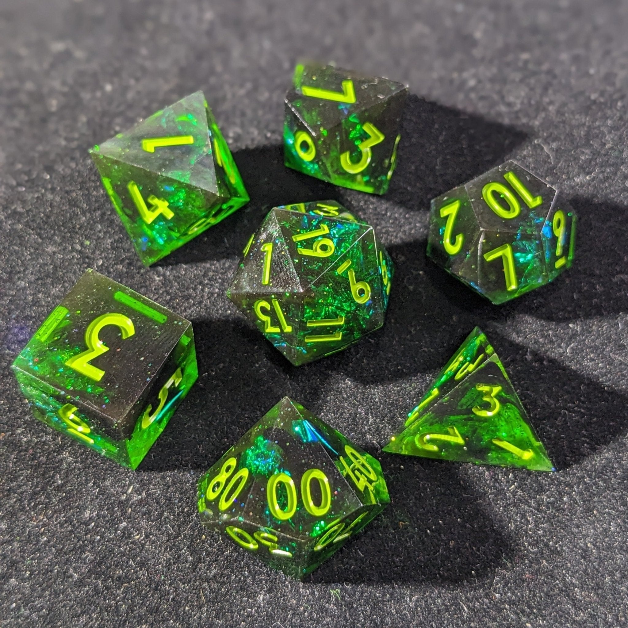 This polyhedral dice set includes 7 sharp edge resin dice: