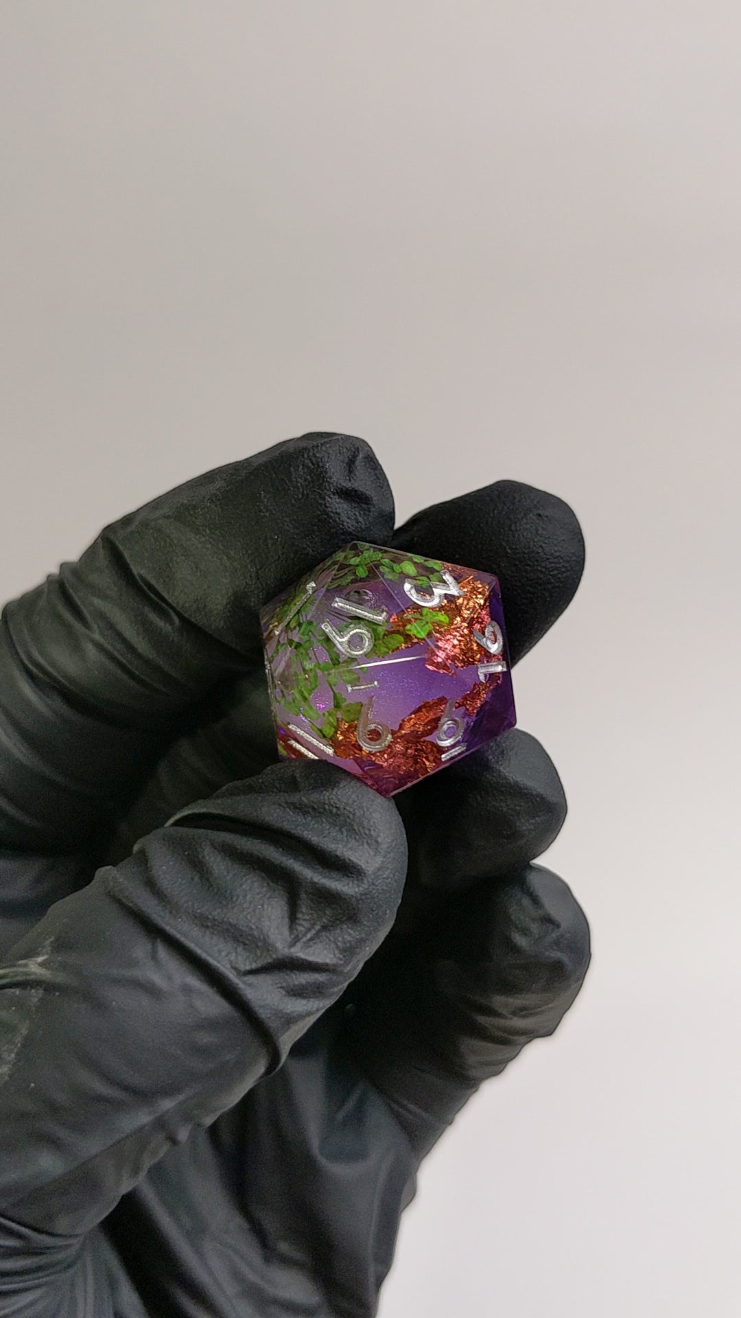 Step into a forest of magic and mystery with the Twilight Trefoil dice set—a handcrafted liquid core polyhedral dice set designed to elevate your TTRPG experience. These sharp edge resin dice feature lush green foliage and metallic foil fragments suspended in crystal-clear, purple-toned resin. At the center of each die, a swirling glitter liquid core brings your rolls to life, catching the light with every move.