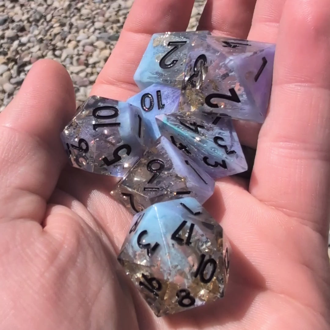 Drift into the arcane with Whispering Vial, a sharp edge polyhedral dice set that captures the essence of bottled magic. Swirling with soft lavender and misty blue, these handmade dice evoke the look of alchemical cultures blooming in glass — like a petrie dish left under moonlight.